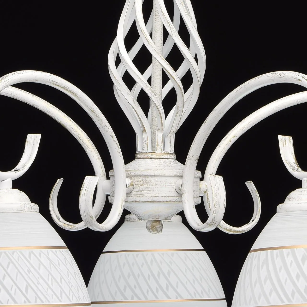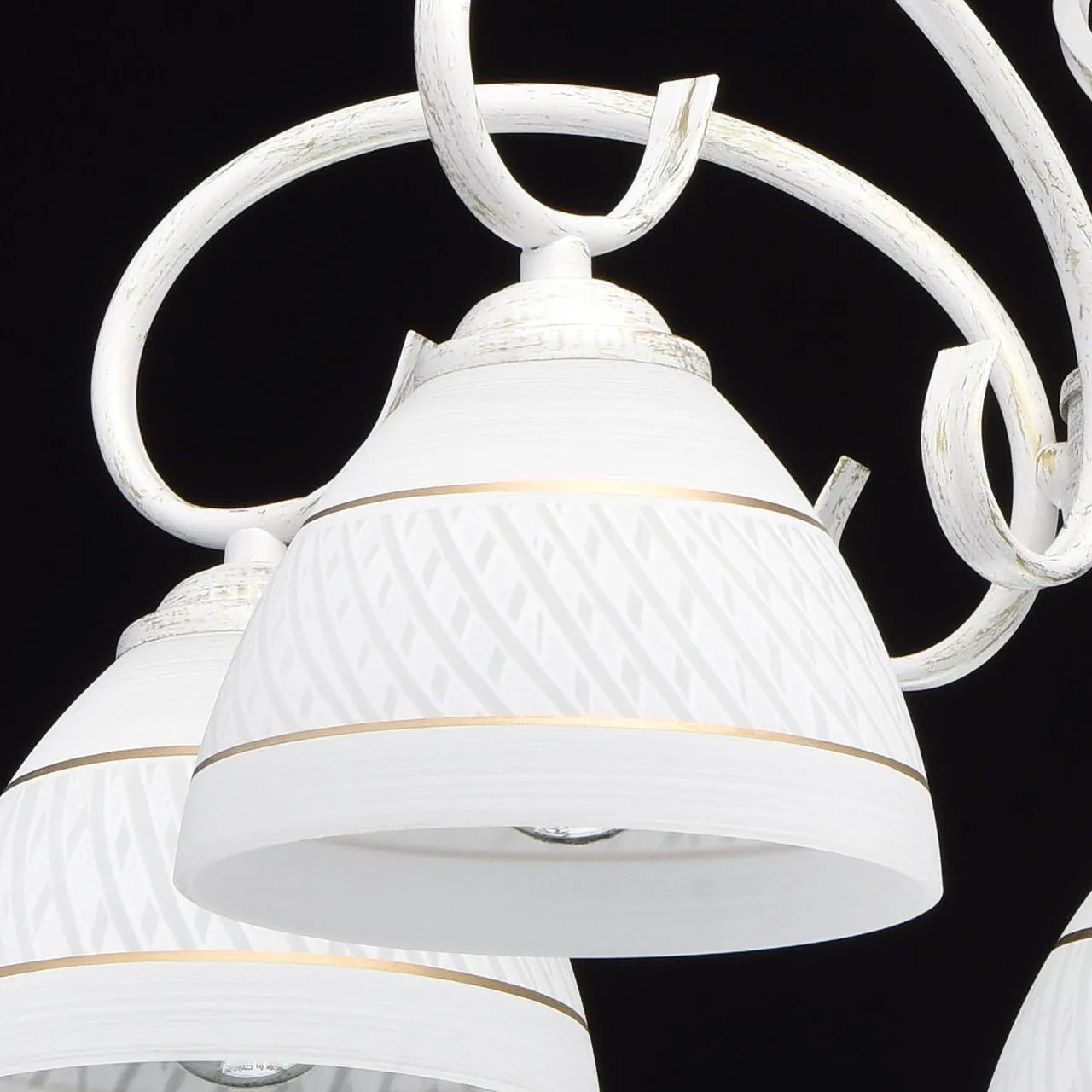 Металлическое основание, окрашенное в белый цвет с золотистой патиной . Плафоны из стекла, отлитого