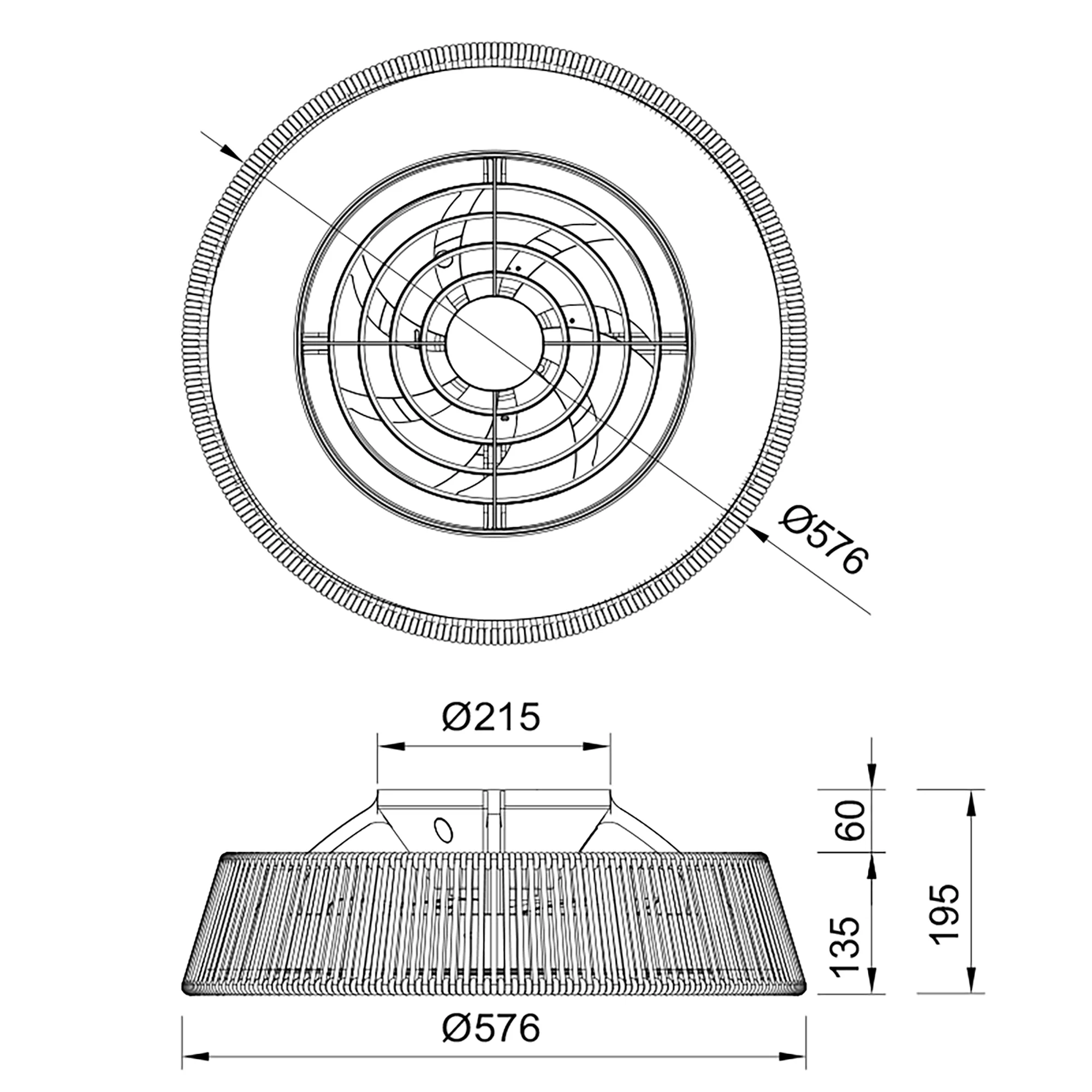 Вентилятор мощностью 35 Вт и 25 Вт установлен за сеткой абажура с замысловатым узором, который создает оптическую иллюзию и добавляет вентилятору эстетичности.